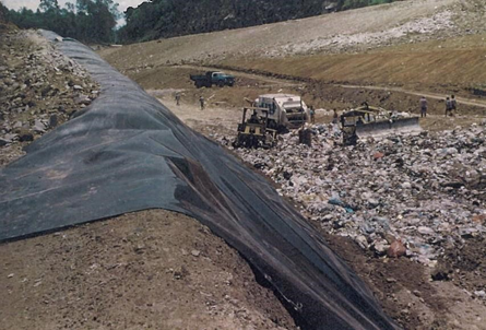 Em seguida à instalação do geotêxtil Bidim foi instalada a geomembrana PEAD com espessura de 2 mm. Após instalação, dispôs-se o lixo diretamente sobre a geomembrana, com a finalidade de evitar a propagação de mau cheiro, o espalhamento pelo vento de papéis e outros, a proliferação de vetores, roedores e fogo, a penetração de água e facilitar o movimento equipamentos na área o lixo recebe o recobrimento diário.